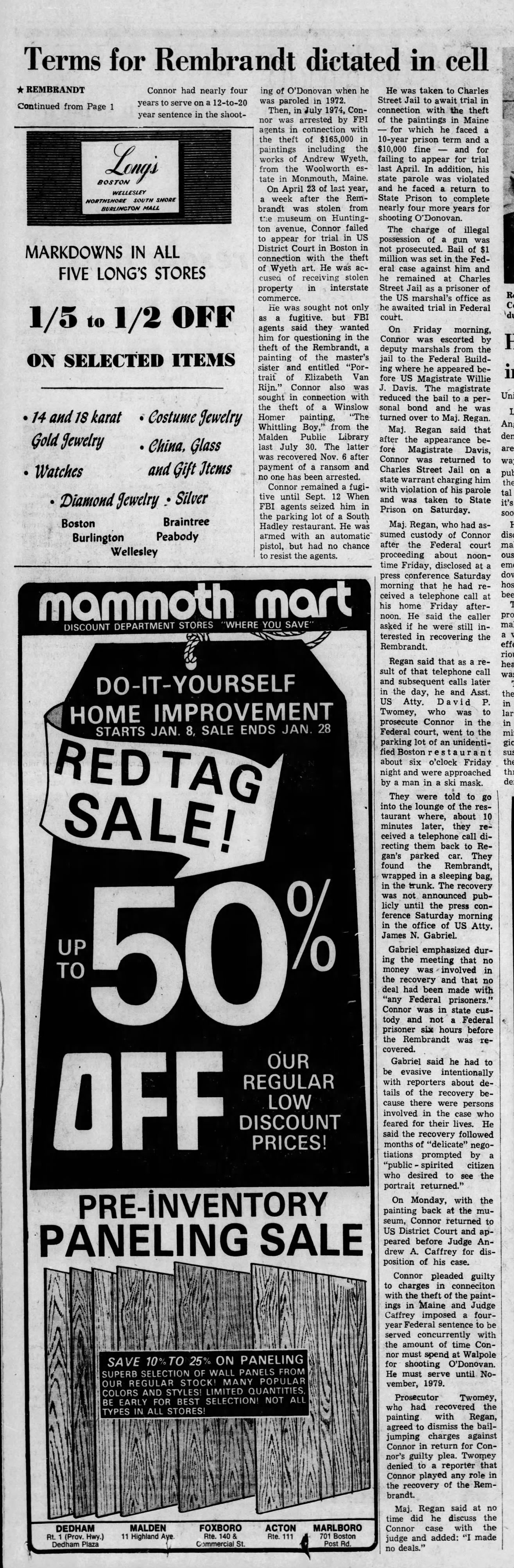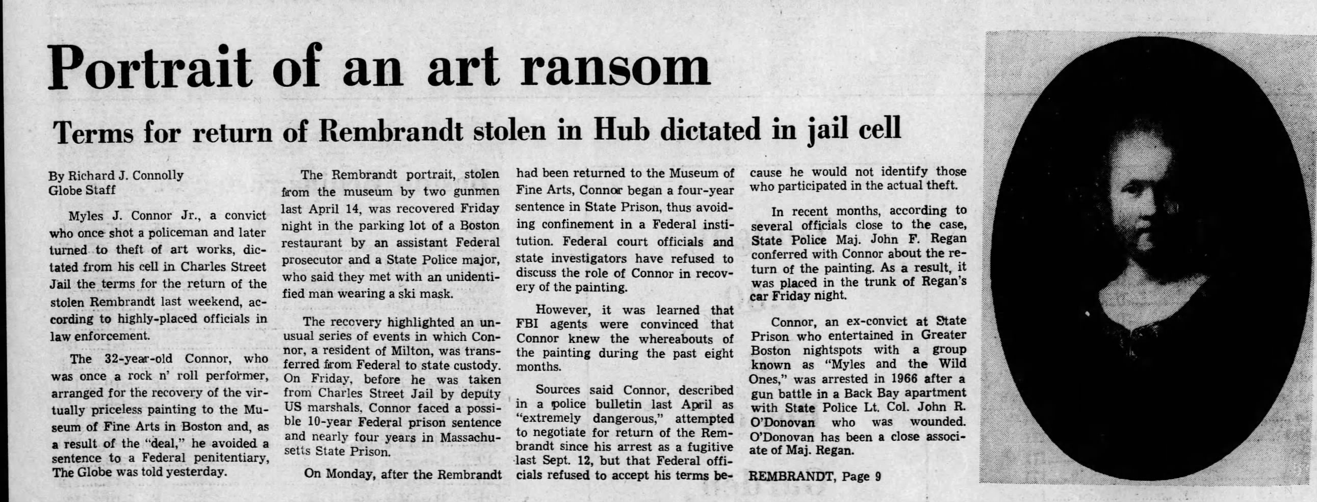 Deal for stolen Rembrandt made in jail cell. Boston Globe January 9, 1976