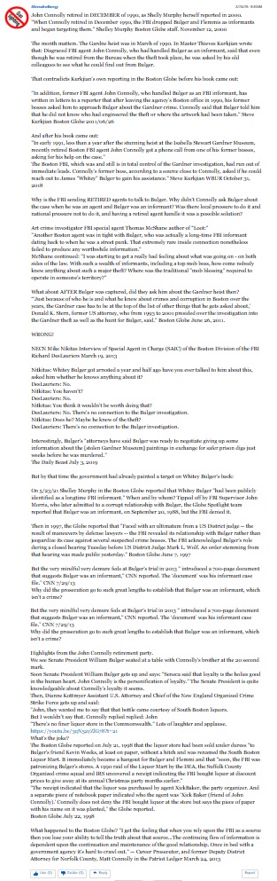 In addition, the public long ago lost interest in the fate of John Connolly. He could have been freed an appeal years ago, and the public would have been satisfied, by decades in prison he had served. Yet the FBI persists. What is their big effing problem with John Connolly? It has to be something big. My comment today was basically a historical rundown of Connolly's relationship with his informant, Bulger, and the Boston Globe's coverage of it. A blog post I wrote five years ago called "Spinning Whitey Bulger's Grave," goes into some of the other details not mentioned in this comment.The only changes I made were to fix a couple of typos. (Okay I updated it, there are more changes than that now.) I also linked to the source documents, which I did not included in my comment. My comment on: "Whitey’ Bulger’s manuscript insists ex-FBI agent was ‘sacrificial lamb,'" by Shelley Murphy Boston Globe March 25, 2026 John Connolly retired in DECEMBER of 1990, as Shelly Murphy herself reported in 2000. "When Connolly retired in December 1990, the FBI dropped Bulger and Flemmis as informants and began targeting them." Shelley Murphy Boston Globe staff. November 12, 2000 The month matters. The Gardner heist was in March of 1990. In his book Master Thieves Kurkjian wrote that: "Disgraced FBI agent John Connolly, who had handled Bulger as an informant, said that even though he was retired from the Bureau when the theft took place, he was asked by his old colleagues to see what he could find out from Bulger." That contradicts Kurkjian's own reporting in the Boston Globe before his book came out: "In addition, former FBI agent John Connolly, who handled Bulger as an FBI informant, has written in letters to a reporter that after leaving the agency’s Boston office in 1990, [he didn't leave until nine months after the Gardner heist] his former bosses asked him to approach Bulger about the Gardner crime. Connolly said that Bulger told him that he did not know who had engineered the theft or where the artwork had been taken." Steve Kurkjian Boston Globe 2011/06/26 And after his book came out: "In early 1991, less than a year after the stunning heist at the Isabella Stewart Gardner Museum, recently retired Boston FBI agent John Connolly got a phone call from one of his former bosses, asking for his help on the case." The Boston FBI, which was and still is in total control of the Gardner investigation, had run out of immediate leads. Connolly's former boss, according to a source close to Connolly, asked if he could reach out to James "Whitey" Bulger to gain his assistance." Steve Kurkjian WBUR October 31, 2018Why is the FBI sending RETIRED agents to talk to Bulger? Why didn't Connolly ask Bulger about the case when he was an agent and Bulger was an informant? Was there local pressure to do it and national pressure not to do it, and having a retired agent handle it was a possible solution? Art crime investigator FBI special agent Thomas McShane author of “Loot": "Another Boston agent was in tight with Bulger, who was actually a long-time FBI informant dating back to when he was a street punk. That extremely rare inside connection nonetheless failed to produce any worthwhile information." McShane continued: "I was starting to get a really bad feeling about what was going on - on both sides of the law. With such a wealth of informants, including a top mob boss, how come nobody knew anything about such a major theft? Where was the traditional "mob blessing" required to operate in someone's territory?" What about AFTER Bulger was captured, did they ask him about the Gardner heist then? “'Just because of who he is and what he knew about crimes and corruption in Boston over the years, the Gardner case has to be at the top of the list of other things that he gets asked about,' Donald K. Stern, former US attorney, who from 1993 to 2001 presided over the investigation into the Gardner theft as well as the hunt for Bulger, said." Boston Globe June 26, 2011. WRONG! NECN Mike Nikitas Interview of Special Agent in Charge (SAIC) of the Boston Division of the FBI Richard DesLauriers March 19, 2013 Nitkitas: Whitey Bulger got arrested a year and half ago have you ever talked to him about this, asked him whether he knows anything about it?DesLauriers: No. Nitkitas: You haven't? DesLauriers: No. Nitkitas: You think it wouldn't be worth doing that? DesLauriers: No. There's no connection to the Bulger investigation. Nitkitas: Does he? Maybe he knew of the theft? DesLauriers: There's no connection to the Bulger investigation. The Boston Globe article was called: "Whitey Bulger arrest may yield clues on Gardner heist," but the arrest can't yield clues if he isn't even asked, which as is generally the case with this so called "investigation" is the whole point. "Interestingly, Bulger's "attorneys have said Bulger was ready to negotiate giving up some information about the [stolen Gardner Museum] paintings in exchange for safer prison digs just weeks before he was murdered." —The Daily Beast July 3, 2019 That would be a pretty malicious and provably false lie if it were not true, but Bulger's lead attorney did not seem to suffer any consequences from it. Five years later Brennan was appointed as a special prosecutor by District Attorney Michael Morrissey in the Karen Reed case, while the Feds had an adjacent case going concurrently. A year earlier, The U.S. Attorney's Office begin investigating the actions of law enforcement in the case. That case was dismissed in 2025. It was too late for Bulger, to ahem "negotiate" with the government, since they had already painted a target on Whitey Bulger's back at his trial. On 5/23/21 Shelley Murphy in the Boston Globe reported that Whitey Bulger "had been publicly identified as a longtime FBI informant." When and by whom? Tipped off by FBI Supervisor John Morris, who later admitted to a corrupt relationship with Bulger, the Globe Spotlight team reported that Bulger was an informan