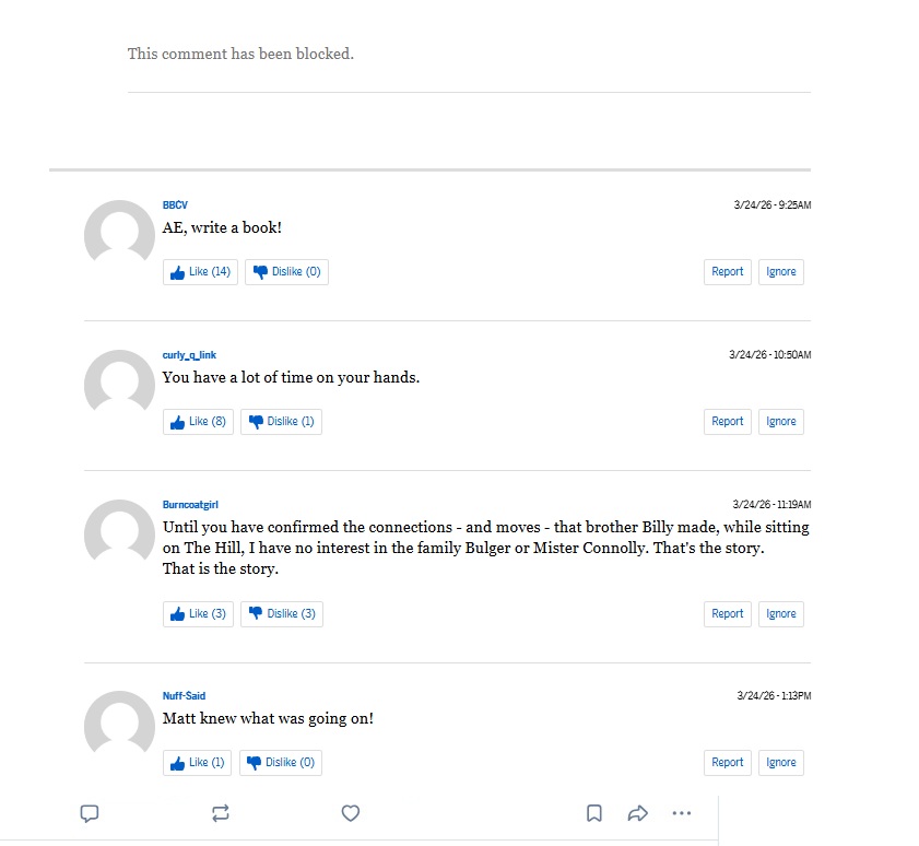 In addition, the public long ago lost interest in the fate of John Connolly. He could have been freed an appeal years ago, and the public would have been satisfied, by decades in prison he had served. Yet the FBI persists. What is their big effing problem with John Connolly? It has to be something big. My comment today was basically a historical rundown of Connolly's relationship with his informant, Bulger, and the Boston Globe's coverage of it. A blog post I wrote five years ago called "Spinning Whitey Bulger's Grave," goes into some of the other details not mentioned in this comment.The only changes I made were to fix a couple of typos. (Okay I updated it, there are more changes than that now.) I also linked to the source documents, which I did not included in my comment. My comment on: "Whitey’ Bulger’s manuscript insists ex-FBI agent was ‘sacrificial lamb,'" by Shelley Murphy Boston Globe March 25, 2026 John Connolly retired in DECEMBER of 1990, as Shelly Murphy herself reported in 2000. "When Connolly retired in December 1990, the FBI dropped Bulger and Flemmis as informants and began targeting them." Shelley Murphy Boston Globe staff. November 12, 2000 The month matters. The Gardner heist was in March of 1990. In his book Master Thieves Kurkjian wrote that: "Disgraced FBI agent John Connolly, who had handled Bulger as an informant, said that even though he was retired from the Bureau when the theft took place, he was asked by his old colleagues to see what he could find out from Bulger." That contradicts Kurkjian's own reporting in the Boston Globe before his book came out: "In addition, former FBI agent John Connolly, who handled Bulger as an FBI informant, has written in letters to a reporter that after leaving the agency’s Boston office in 1990, [he didn't leave until nine months after the Gardner heist] his former bosses asked him to approach Bulger about the Gardner crime. Connolly said that Bulger told him that he did not know who had engineered the theft or where the artwork had been taken." Steve Kurkjian Boston Globe 2011/06/26 And after his book came out: "In early 1991, less than a year after the stunning heist at the Isabella Stewart Gardner Museum, recently retired Boston FBI agent John Connolly got a phone call from one of his former bosses, asking for his help on the case." The Boston FBI, which was and still is in total control of the Gardner investigation, had run out of immediate leads. Connolly's former boss, according to a source close to Connolly, asked if he could reach out to James "Whitey" Bulger to gain his assistance." Steve Kurkjian WBUR October 31, 2018Why is the FBI sending RETIRED agents to talk to Bulger? Why didn't Connolly ask Bulger about the case when he was an agent and Bulger was an informant? Was there local pressure to do it and national pressure not to do it, and having a retired agent handle it was a possible solution? Art crime investigator FBI special agent Thomas McShane author of “Loot": "Another Boston agent was in tight with Bulger, who was actually a long-time FBI informant dating back to when he was a street punk. That extremely rare inside connection nonetheless failed to produce any worthwhile information." McShane continued: "I was starting to get a really bad feeling about what was going on - on both sides of the law. With such a wealth of informants, including a top mob boss, how come nobody knew anything about such a major theft? Where was the traditional "mob blessing" required to operate in someone's territory?" What about AFTER Bulger was captured, did they ask him about the Gardner heist then? “'Just because of who he is and what he knew about crimes and corruption in Boston over the years, the Gardner case has to be at the top of the list of other things that he gets asked about,' Donald K. Stern, former US attorney, who from 1993 to 2001 presided over the investigation into the Gardner theft as well as the hunt for Bulger, said." Boston Globe June 26, 2011. WRONG! NECN Mike Nikitas Interview of Special Agent in Charge (SAIC) of the Boston Division of the FBI Richard DesLauriers March 19, 2013 Nitkitas: Whitey Bulger got arrested a year and half ago have you ever talked to him about this, asked him whether he knows anything about it?DesLauriers: No. Nitkitas: You haven't? DesLauriers: No. Nitkitas: You think it wouldn't be worth doing that? DesLauriers: No. There's no connection to the Bulger investigation. Nitkitas: Does he? Maybe he knew of the theft? DesLauriers: There's no connection to the Bulger investigation. The Boston Globe article was called: "Whitey Bulger arrest may yield clues on Gardner heist," but the arrest can't yield clues if he isn't even asked, which as is generally the case with this so called "investigation" is the whole point. "Interestingly, Bulger's "attorneys have said Bulger was ready to negotiate giving up some information about the [stolen Gardner Museum] paintings in exchange for safer prison digs just weeks before he was murdered." —The Daily Beast July 3, 2019 That would be a pretty malicious and provably false lie if it were not true, but Bulger's lead attorney did not seem to suffer any consequences from it. Five years later Brennan was appointed as a special prosecutor by District Attorney Michael Morrissey in the Karen Reed case, while the Feds had an adjacent case going concurrently. A year earlier, The U.S. Attorney's Office begin investigating the actions of law enforcement in the case. That case was dismissed in 2025. It was too late for Bulger, to ahem "negotiate" with the government, since they had already painted a target on Whitey Bulger's back at his trial. On 5/23/21 Shelley Murphy in the Boston Globe reported that Whitey Bulger "had been publicly identified as a longtime FBI informant." When and by whom? Tipped off by FBI Supervisor John Morris, who later admitted to a corrupt relationship with Bulger, the Globe Spotlight team reported that Bulger was an informan