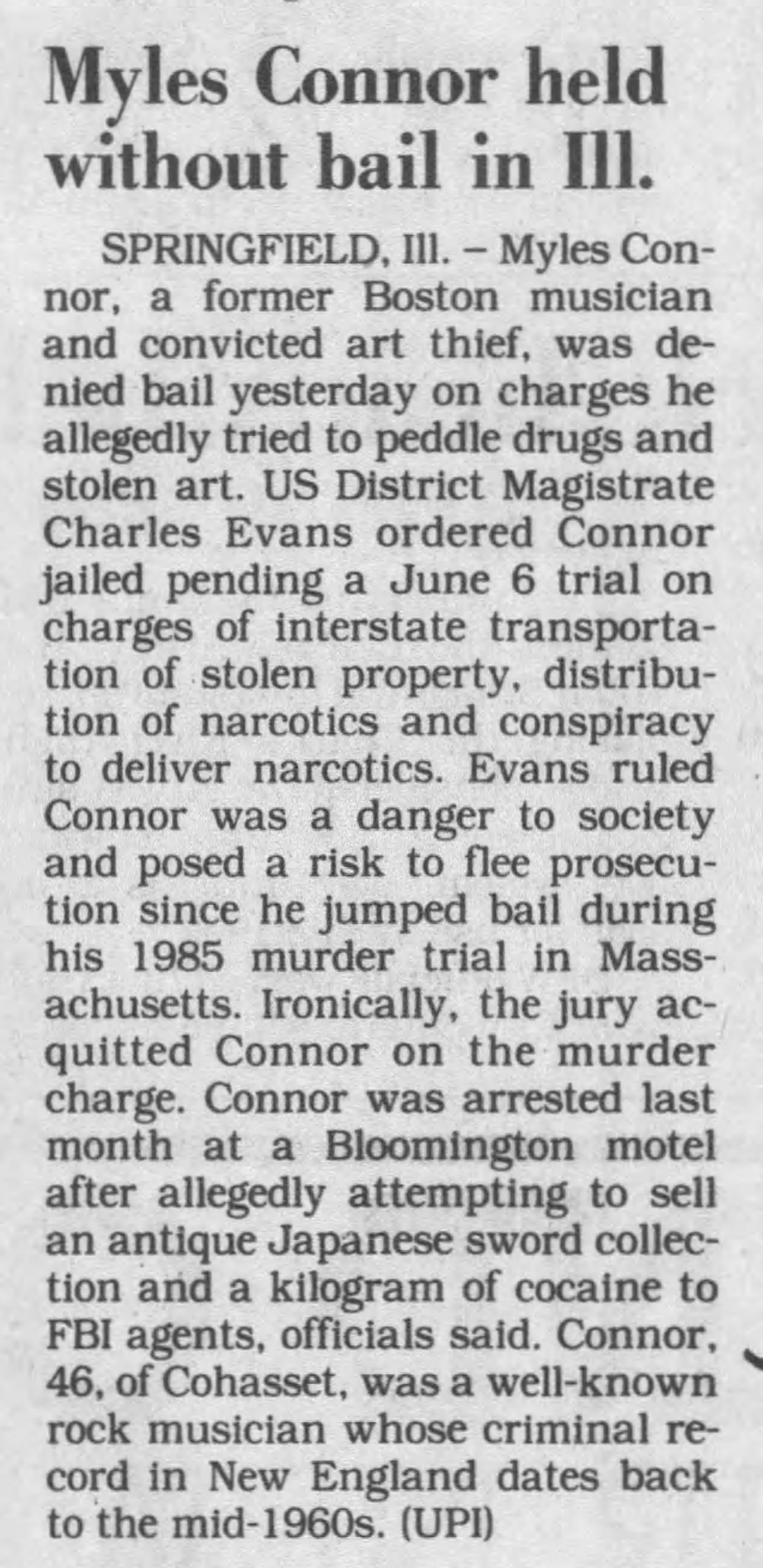 Myles Connor held without bail in Illinois The Boston Globe (UPI) April 12, 1989