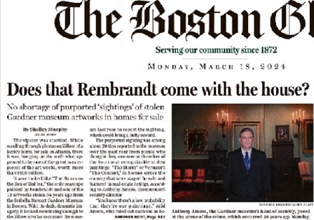 As if on cue during the interview, Mr. Amore’s phone rang. It was [purportedly] a man who calls so often with outlandish claims that Mr. Amore has affixed a Post-it note to his phone reminding him not to answer calls from that number. The fact that no informant has stepped forward in all these years speaks to a quintessential Boston characteristic — the “closed culture” and tribal nature of its people, especially small-time hoodlums, he said, who would likely confess to a murder before informing on someone."Clock Is Ticking on $10 Million Reward in Gardner Art Heist By Katharine Q. Seelye Dec. 28, 2017 Have You Seen These Paintings? $10 Million Reward Offered For Artwork Stolen in 1990 You have just three days to find them. Inside Edition December 28, 2017“We are desperate,” Amore said. Cracking the Biggest Art Heist in History June 20, 2017 "There is one outside detective respected by Amore—Arthur Brand, a Dutch private investigator—who believes not only are the artworks still intact, but also that he can bring them home. This year." 'There are very few like him who understand the reality of this sort of crime,' Amore said."