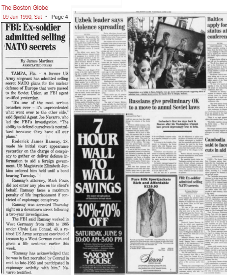 Removed portions included: "Ramsay’s last known contact with Conrad came in January 1986 in Boston, when his former boss gave him a small cow bell and told him that anyone displaying a similar bell was involved in the spy ring, the agent testified."